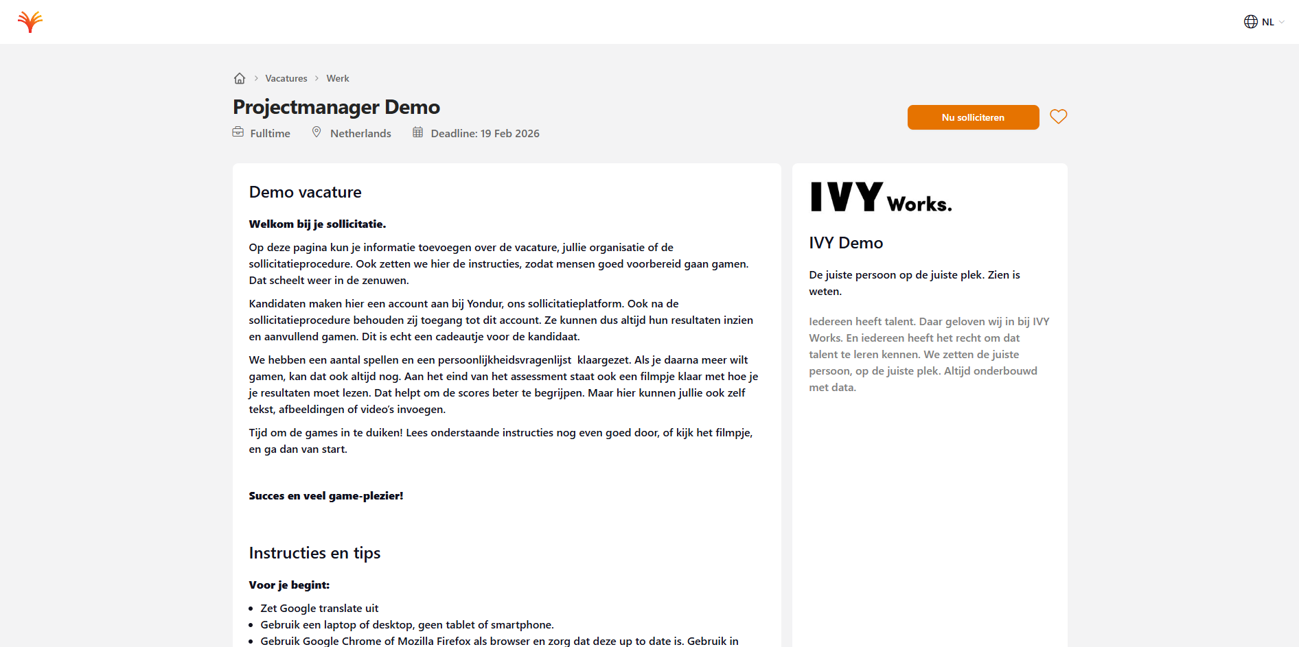 - Het zijn serieuze assessments. Zorg dat je uitgerust bent en in een rustige omgeving zit.