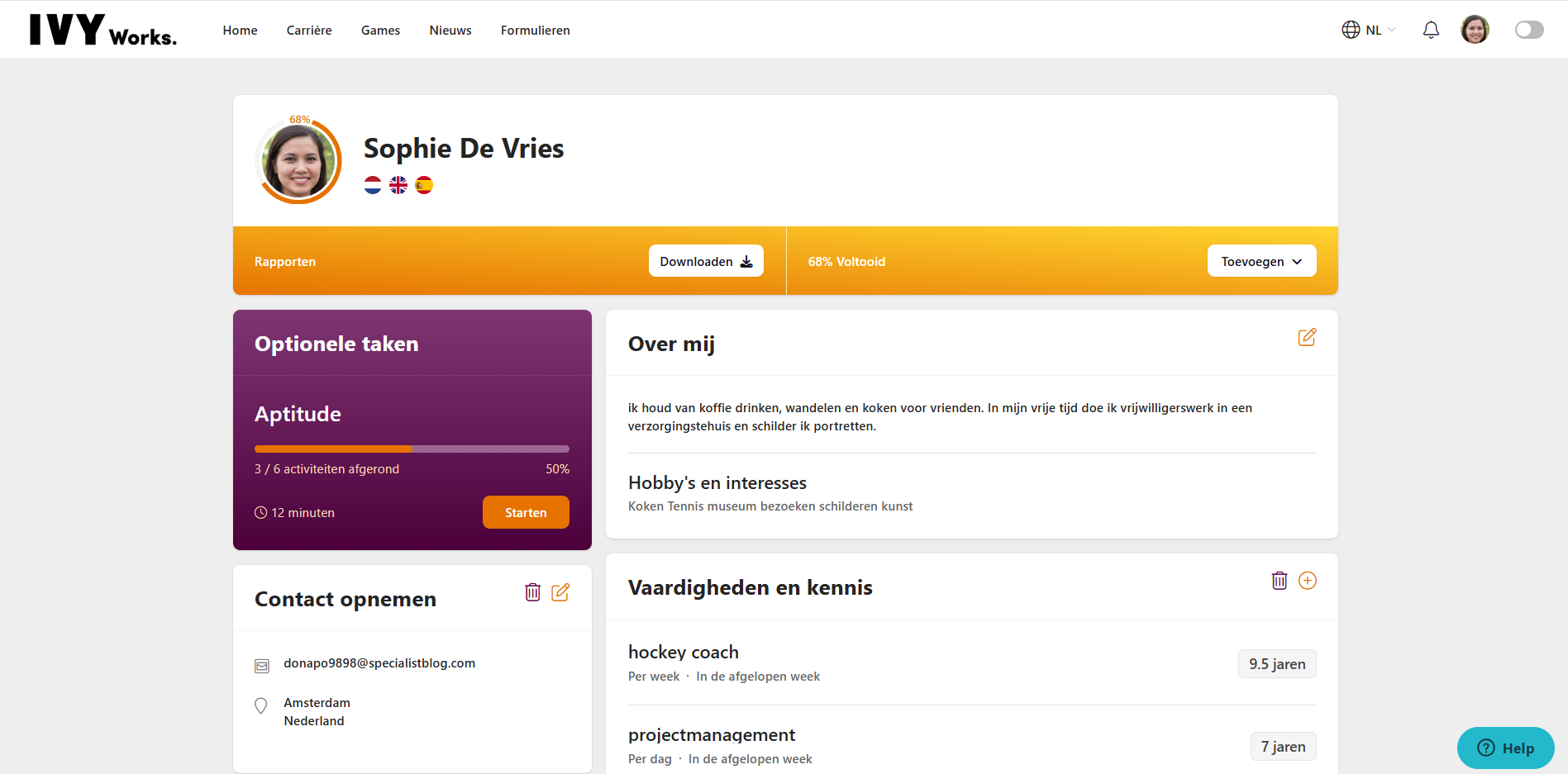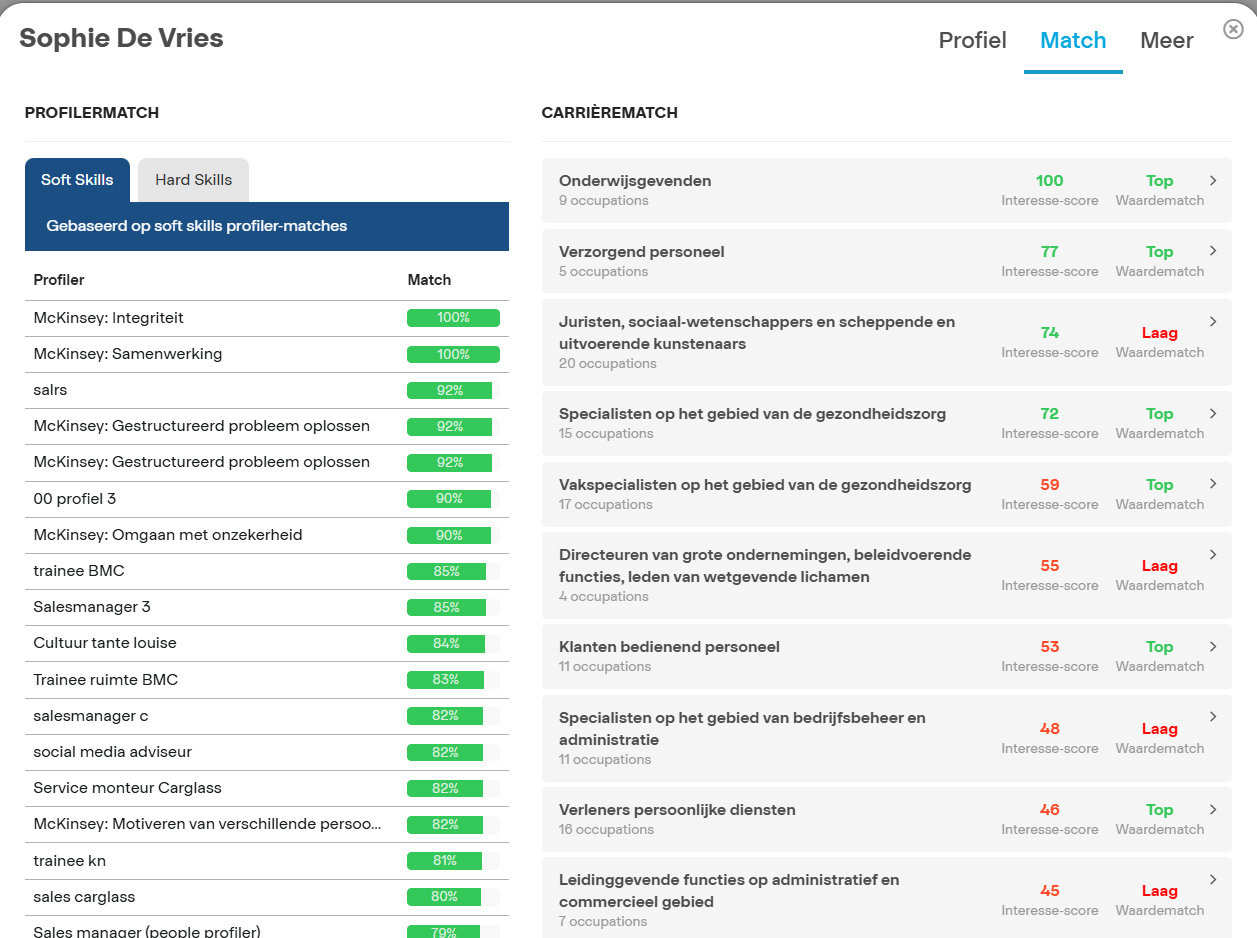 - Per beroepsgroep zie je ook een vaardighedenmatch voor de beroepen (mits de juiste game-based assessments zijn gemaakt).