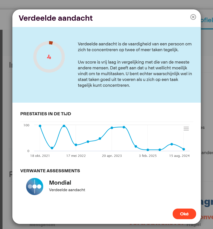 Dit rapport laat alle resultaten zien. De resultaten zijn verdeelt per categorie: cognitie, persoonlijkheid, gedrag, etc. Per categorie zijn meerdere persoonskenmerken of attributen weergegeven die zijn gegeven. Daarbij staat een stukje tekst met wat zo’n persoonskenmerk betekent. Let op hoe ook in deze omschrijving er heel voorzichtig uitspraken gedaan worden over de resultaten. Belangrijk: trek geen conclusies op basis van dit rapport alleen. De resultaten hebben alleen betekenis als je met de kandidaat ook gesproken hebt.