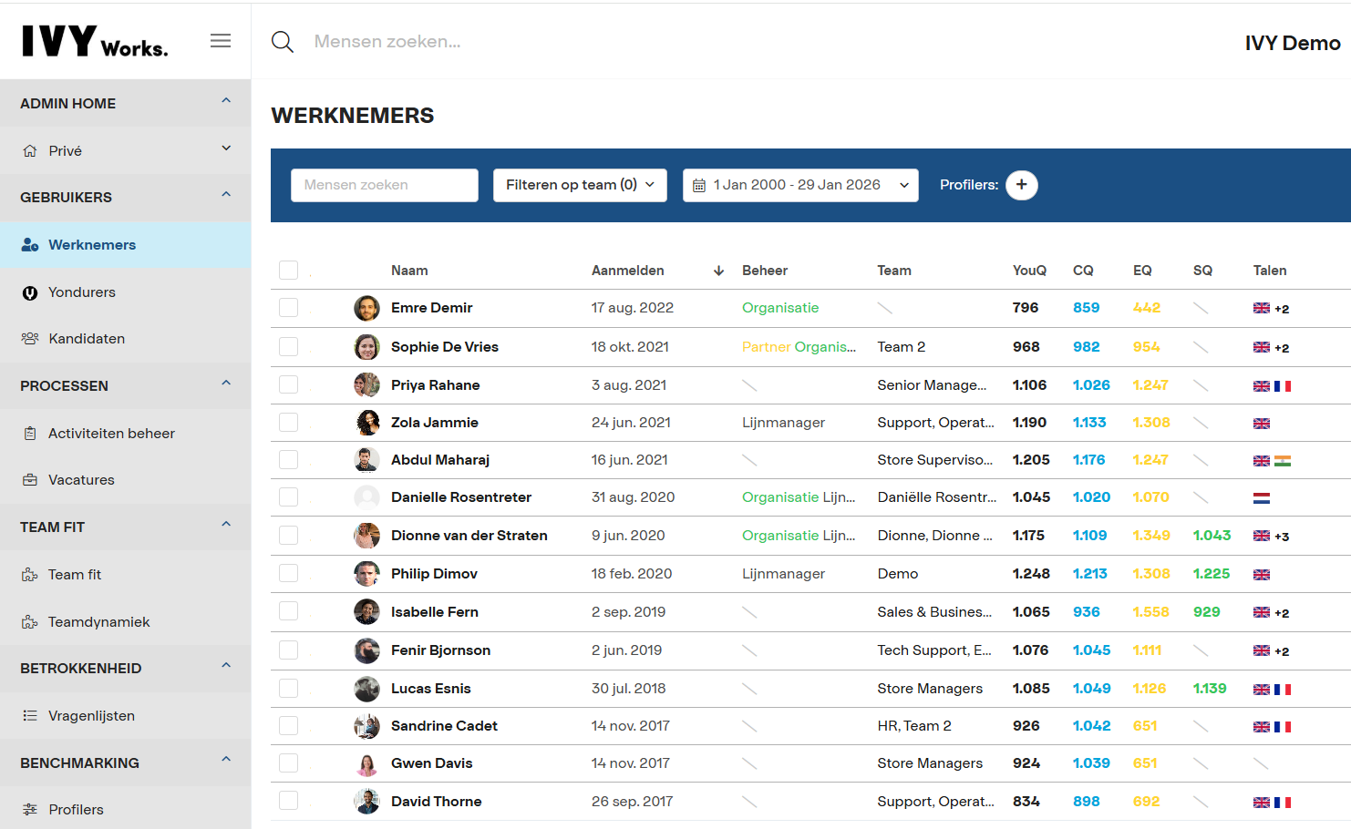 Hier vind je hoe elke kandidaat scoort op het algemene profiel én alle onderliggende gemeten competenties. Vanuit hier zou je het kunnen kopiëren naar Excel.