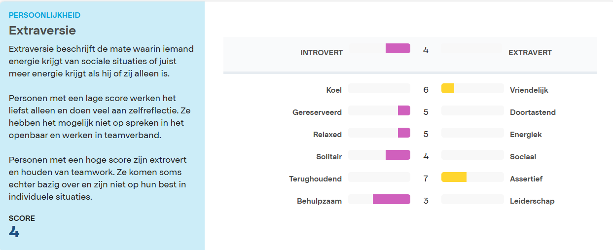 4. Na het klikken op de blauwe bol zie je hoe iemand scoort op de onderliggende persoonskenmerken van de gemeten competenties zoals op onderstaande afbeelding: