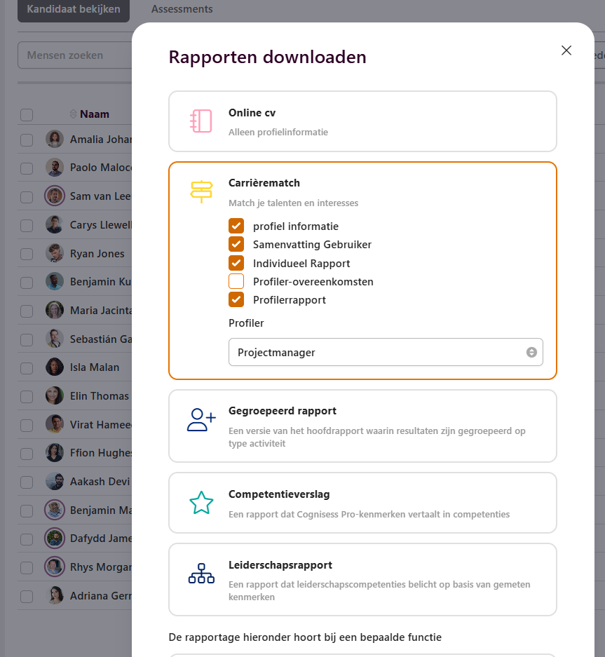 Zoals je ziet kan je verschillende rapporten downloaden. Wij raden aan een van de onderste 2 rapporten te gebruiken voor kandidaten die hebben gesolliciteerd op een vacature: fucntierapport of acitivity report.